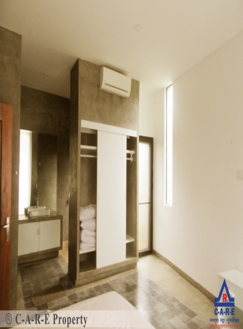 Stylish 2-bedroom apartment stays in Slakram commune, Siem Reap city now available for rent. The unit comes with fully furnished, with/without balcony, leafy tropical garden and spacious parking area. Every bedroom comes with air-con unit and an en-suite bathroom with hot water. Furthermore the living room area is quite big and comes furnished and a nice sofa set with a television. The kitchen is big with an ample space for cooking and comes complete with refrigerator, dining table set and gas stove set. The surrounding environment is secured and the road condition is good.